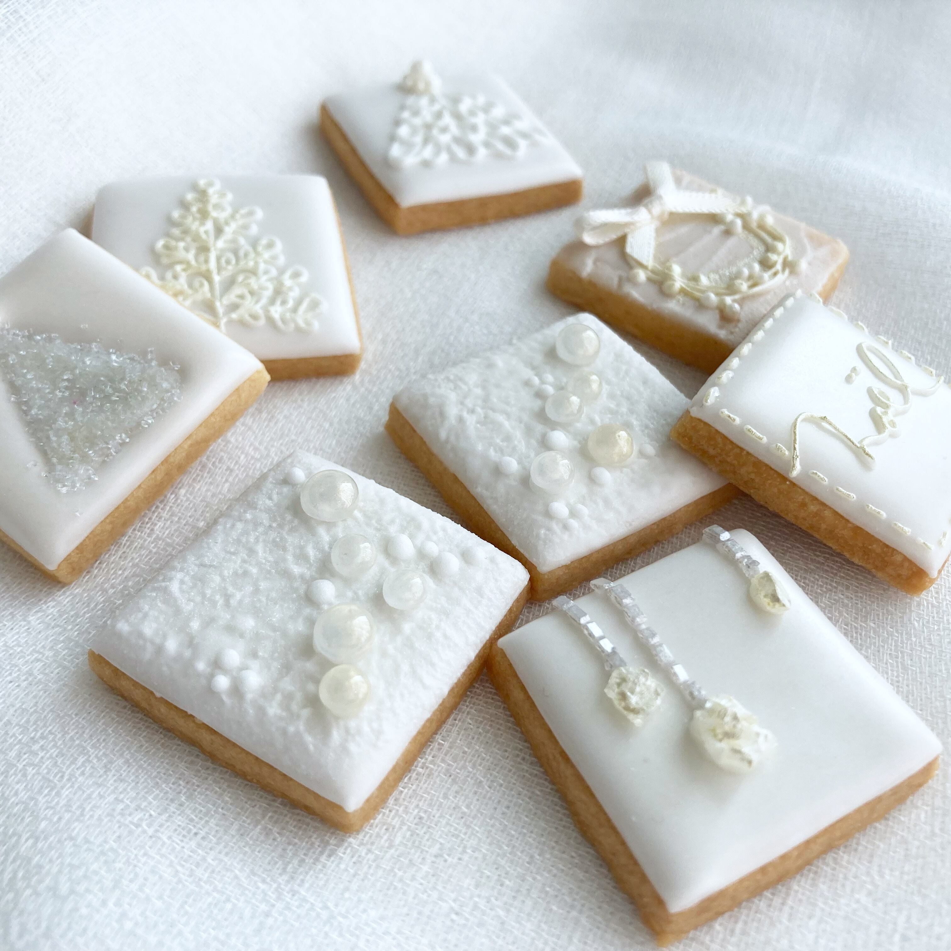 一口サイズの小さなクッキーにクリスマスデザインのアイシングを施します。